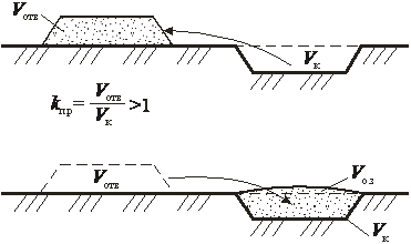 | Рис. .. Изменение объема грунта при его перемещении: Vк – объем котлована; Vотв – объем отвала; Vо.з – объем обратной за- сыпки |