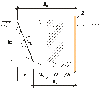 | Рис. .. Определение размеров выемки: 1 – возводимая конструкция; 2 – шпунтовое ограждение; Bн, Bв – ширина выемки по низу и по верху соответственно; H – глубина выемки; c – заложение откоса |