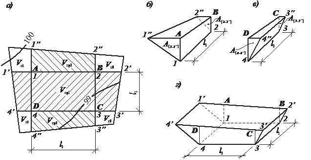 а – разбивка котлована на призматоиды и перевернутые пирамиды; б, в, г – призматоиды, ограниченные сечениями A-1-1’ и B-2-2’, C-3-3’ и D-4-4’, 4-4’-3-3’ и 1-1’-2-2’ соответственно
