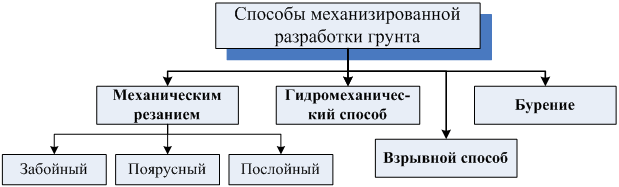 Грунт разрабатывают механизированно: механическим резанием, гидромеханическим и взрывным способами, а также бурением.