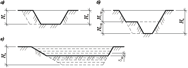 а – забойным способом; б – поярусным способом; в – послойным способом; Hз – глубина забоя; Hк – глубина котлована; H1 яр, H2 яр – глубина первого и второго яруса соответственно; сл – толщина слоя