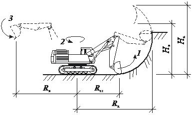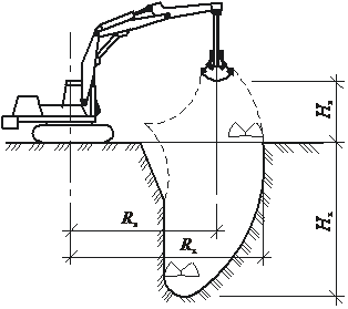 Rк, Rв – наибольший радиус копания и выгрузки соответственно; Hк – наибольшая глубина копания; Hв – наибольшая высота выгрузки