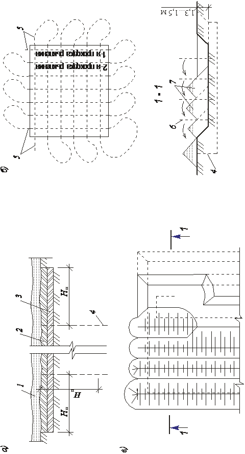 | Рис. 10.3. Способы предохранения грунтов от промерзания: а – вспахивание и боронование; б – перекрестное рыхление; в – глубокое рыхление перелопачиванием; 1 – снег; 2 – заборонованный грунт; 3 – вспаханный грунт; 4 – проектный контур котлована; 5 и 6 – оси перемещения рыхлителя и эксковатора; 7 – разрыхленный экскаватором грунт |