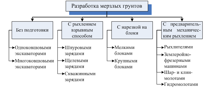 Подготавливают мерзлые грунты к разработке в зимний период при слиянии деятельного слоя с вечной мерзлотой преимущественно взрывным способом. Если слой сезонно мерзлых грунтов не сливается с вечной мерзлотой, то его рыхлят или нарезают на блоки механическими способами. Послойное рыхление навесными рыхлителями и фрезами применяют при температурах сезонно-мерзлых и вечномерзлых грунтов не ниже -5 °С. Искусственное оттаивание вечномерзлых грунтов допускается при технико-экономическом обосновании.