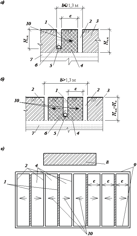 а – в траншеях шириной до 1,3 и при глубине щелей до 1,5 м; б – то же в траншеях шириной более 1,3 м; в – то же в щели, если глубина не более 1,5 м; 1 – зарядные щели; 2 – компенсирующие щели; 3 – мерзлый грунт; 4 – зоны рыхления мерзлого грунта; 5 – заряд ВВ; 6 – забойный материал; 7 – направление действия заряда ВВ; 8 – охраняемый объект; 9 – оконтуривающая щель; 10 – направление разлета взорванного грунта