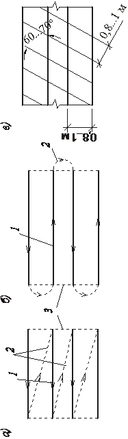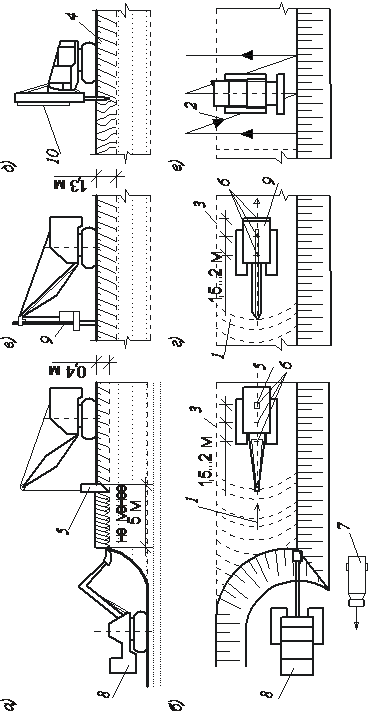 | Рис. 10.6. Схемы движения навесных такторных рыхлителей на захватке: а – челночная схема работы рыхлителя; б – то же поворотная; в – перекрестное рыхление прицепными и навесными рыхлителями; 1 – рабочий ход; 2 – холостой ход; 3 – граница раз- работки грунта | Рис. 10.7. Технология механического рыхления грунтов: а – рыхление клин-молотом (разрез); б – то же план; в – рыхление клиновыми рыхлителями на экскаваторе (разрез); г – то же план; д – рыхление трехклинным мерзлоторыхлителем на тракторе (разрез); е – то же план; 1 – рабочий ход рыхлителя; 2 – холостой ход рыхлителя; 3 – граница рыхлителя; 4 – мерзлый грунт; 5 – клин-молот на экскаваторе; 6 – места стоянок рыхлителя; 7 – автосамосвал; 8 – экскаватор; 9 – клиновый рыхлитель с дизель-молотом на экскаваторе; 10 – трехклинный мерзлото- рыхлитель на тракторе |