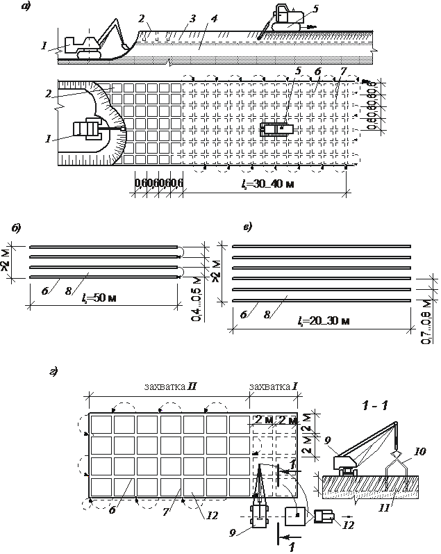 а – мелкими блоками; б – то же в траншеях шириной менне 2 м; в – то же в траншеях шириной более 2 м; г – крупными блоками; 1 – экскаватор; 2 – мелкие блоки мерзлого грунта; 3 – мерзлый грунт; 4 – талый грунт; 5 – буровая машина на тракторе; 6 – продольные щели; 7 – поперечные щели; 8 – полосы мерзлого грунта; 9 – кран; 10 – захват; 11 – крупные блоки мерзлого грунта; 12 – трактор