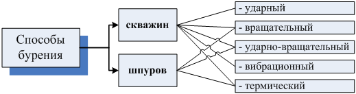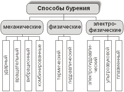 Способы бурения шпуров и скважин делятся на механические (ударный, вращательный, вибрационный, комбинированный) и физические (термический, взрывной, гидравлический, ультразвуковой и др.) (рис. 11.3).