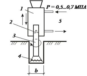 | Рис. 11.5. Ударно-вращательное бурение шпуров: 1 – корпус перфоратора; 2 – хвостовик бура; 3 – буровая штанга; 4 – коронка (головка); 5 – воздух |