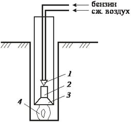 | Рис. 11.7. Термический способ бурения шпуров: 1 – форсунка; 2 – камера сгорания; 3 – термосопло; 4 – пламя |
