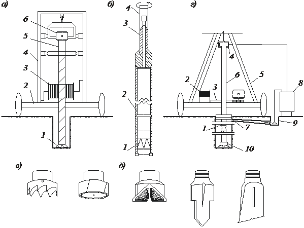 а – станок шнекового бурения: 1 – резец; 2 – платформа; 3 – лебедка; 4 – направляющая стойка; 5 – штанга с ребордой; 6 – электродвигатель; б – колонковый снаряд: 1 – кольцевая коронка; 2 – колонковая труба; 3 – переходная муфта; 4 – вращающаяся штанга станка; в – кольцевые коронки; г – станок роторного бурения: 1 – бурильная труба; 2 – лебедка; 3 – вращатель-ротор; 4 – вертлюг; 5 – вышка; 6 – рабочая труба; 7 – соединительная труба; 8 – насос;