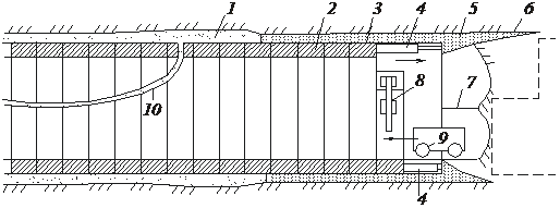 1 – полость, заполняемая бетонной смесью; 2 – обделка тоннеля из тюбингов; 3 – обойма щита; 4 – домкраты; 5 – режущий край; 6 – защитный козырек; 7 – рабочая платформа; 8 – эжектор; 9 – вагонетка; 10 – рукав бетононасоса
