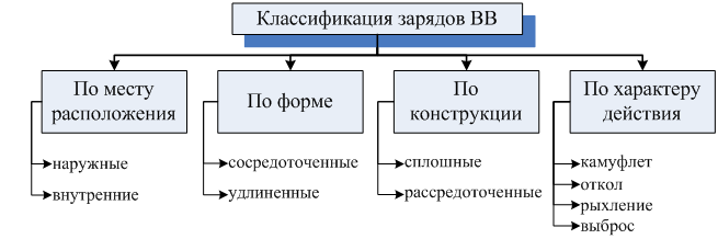 Зарядом называется некоторое количество взрывчатых веществ (ВВ), подготовленное к взрыву. Заряды ВВ принято классифицировать по месту расположения, конструкции, форме, характеру действия (рис. 12.1).