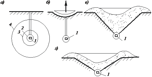а – камуфлета; б – откола; в – рыхления; г – выброса; 1 – заряд ВВ; 2 – сфера сжатия;