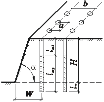| Рис. 12.4. Схема расположения удлиненных зарядов: H – высота уступа; a, b –расстояние между скважинами в ряду и между рядами скважин; – угол наклона откоса уступа к горизонту; W – линия наименьшего сопротивления; lзаб – длина забойки; lзар – длина заряда; lп – длина перебура |