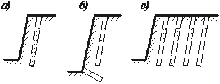 | Рис. 12.6. Основные схемы расположения наклонных скважин: а, б – однорядное соответственно со сплошными или рассредоточенными зарядами; в – многорядное |