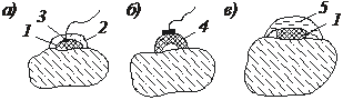| Рис. 12.7. Способы взрывания накладными зарядами: а – обычный накладной заряд; б – кумулятивный заряд; в – накладной заряд с гидроэкранированием; 1 – заряд ВВ; 2 – забойка из глины; 3 – детонатор; 4 – кумулятивный заряд; 5 – пакет с водой |