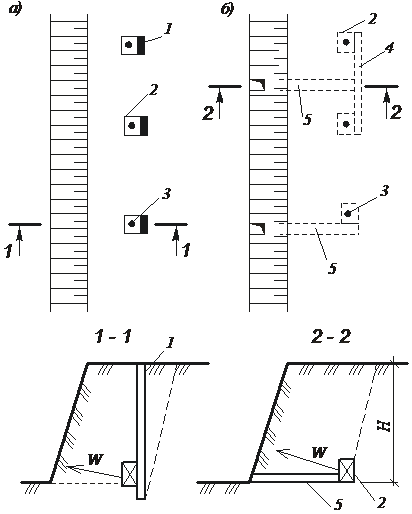 | Рис. 12.8. Схема размещения камерных зарядов при взрывании в карьерах: а – с помощью шурфов; б – с помощью штолен; в – котловое; 1 – шурф; 2– камера; 3 – заряд ВВ; 4 – штрек; 5– штольня; W – линия наименьшего сопротивления; H – высота уступа |