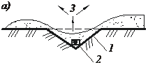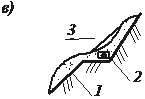 | Рис. 12.9. Схемы взрывов на выброс и сброс: а – при взрыве на выброс с двусторонним размещением; б – то же с односторонним размещением грунта; в – взрыв на сброс; I, II – очередность взрыва зарядов; 1 – проектный контур выемки; 2 – заряд ВВ; 3 – на- правление выброса грунта |