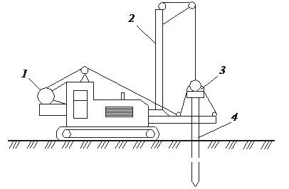 | Рис. 13.11. Схема вибровдавливания сваи: 1 – лебедка для вдавливания сваи; 2 – стрела; 3 – вибропогружатель; 4 – свая |