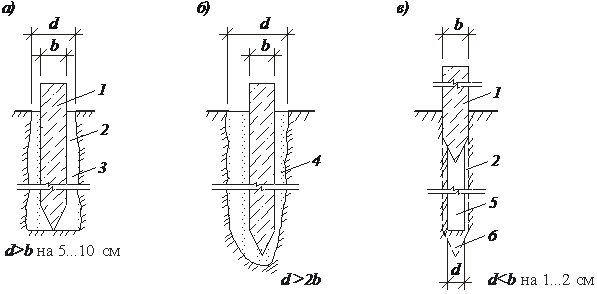 а – буроопускной; б – опускной; в – бурозабивной; 1 – свая; 2 – стенка скважины; 3 – грунтовый раствор; 4 – оттаянный грунт; 5 – лидерная скважина; 6 – проектное положение сваи