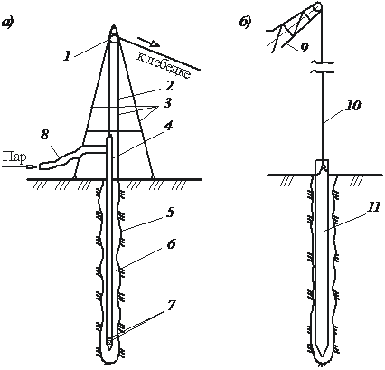 а – оттаивание грунта паром; б – опускание сваи; 1 – блок; 2 – грузовой канат; 3 – опоры; 4 – паровая игла; 5 – граница мерзлого грунта; 6 – разжиженный грунт; 7 – отверстия для выпуска пара; 8 – паропровод; 9 – стрела крана; 10 – канат крана; 11 – свая