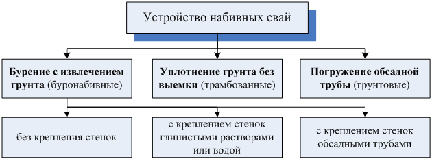 В зависимости от вида грунта набивные сваи устраивают как без крепления стенок, так и с их креплением. Без крепления стенок скважины бетонируют в плотных сухих глинистых грунтах. В водонасыщенных песчаных и в неоднородных грунтах набивные сваи возводят с креплением стенок. Крепление стенок выполняют при помощи обсадных труб (извлекаемых или неизвлекаемых), а также глинистым раствором (или водой), заливаемым с избыточным подпором в скважину.