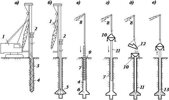 а – бурение скважины; б – разбуривание уширенной полости; в – установка арматурного каркаса; г – установка бетонолитной трубы с вибробункером; д – бетонирование скважины методом вертикально перемещаемой трубы (ВПТ); е – подъем бетонолитной трубы; 1 – буровая установка; 2 – привод; 3 – шнековый рабочий уровень; 4 – скважина; 5 – расширитель; 6 – уширенная полость; 7 – арматурный каркас; 8 – стреловой кран; 9 – кондуктор-патрубок; 10 – вибробункер; 11 – бетонолитная труба; 12 – бункер с бетонной смесью; 13 – уширенная пята сваи