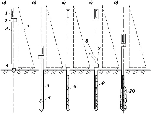 а – установка обсадной трубы с молотом и наголовником на башмак; б – забивка обсадной трубы до проектной отметки; в – установка арматурного каркаса; г – подача бетонной смеси; д – трамбование бетонной смеси и извлечение обсадной трубы; 1 – молот двойного действия; 2 – наголовник; 3 – обсадная труба; 4 – чугунный башмак; 5 – копер; 6 – арматурный каркас; 7 – гибкий шланг; автобетононасоса; 8 – распределительная стрела автобетононасоса; 9 –