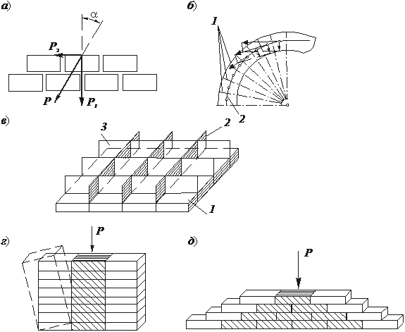 а, б – схемы действующих усилий в кладке стен и арок (к I правилу разрезки); в – схема расчленения кладки вертикальными плоскостями (ко II правилу разрезки); г, д – схемы работы кладки без перевязки и с перевязкой швов (к III правилу разрезки); 1 – постель; 2, 3