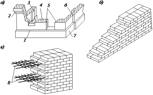 а – детали конструкций стен; б – убежная штраба; в – вертикальная штраба; 1 – обрез; 2 – карниз с напуском кирпичей; 3 – пилястра; 4 – простенок; 5 – четверть; 6 – уступ кладки; 7