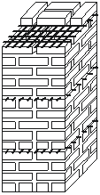 Трехрядная система перевязки (рис. 14.7), предложенная профессором Л.И. Онищиком, является разновидностью многорядной кладки и применяется для кладки столбов и простенков шириной менее 1 м. Трехрядная система перевязки удобна тем, что кладка столбов квадратного сечения выполняется из целых кирпичей, а остальных конструкций – с применением незначительного количества половинок. Выполняют ее чередованием трех ложковых рядов и тычкового, допуская в трех смежных рядах совпадение вертикальных швов, перевязываемых кирпичами 4-гo ряда.