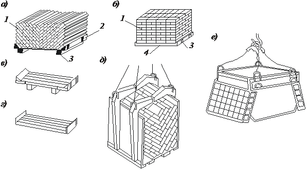а, б – укладка кирпича на поддоны соответственно в елку и с перекрестной перевязкой; в, г – поддоны соответственно на брусках и с крюками; д – подхват-футляр; е - захват-футляр; 1 –кирпич; 2 – поддон на брусках; 3 – бруски (опоры); 4 – площадка поддона с крючьями