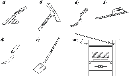 а – кельма; б – молоток-кирочка; в, г, д, – расшивки с вогнутой, выпуклой и прямоугольной рабочей частью соответственно; e – лопата растворная; ж – гильотина для рубки кирпича