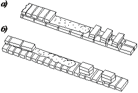 | Рис. 14.12. Раскладка кирпича и расстилание раствора на стенах толщиной в 1 кирпич: а – для тычковой версты; б – для ложковой версты |