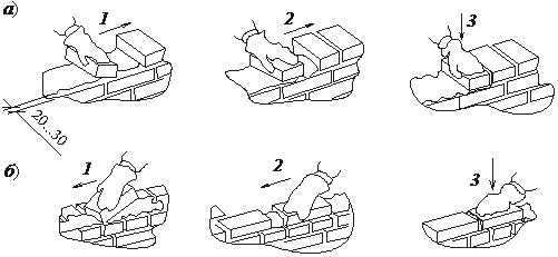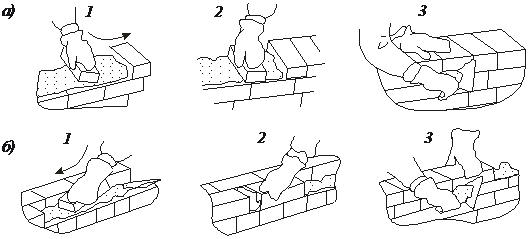 а – тычковых; б – ложковых; 1 – подгребание раствора передней гранью кирпича; 2 – прижатие кирпича к ранее уложенному; 3 – осаживание кирпича