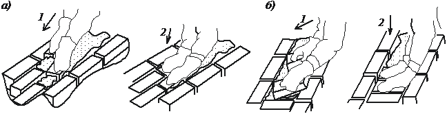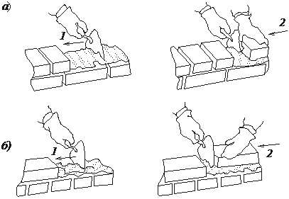 а – ложковых; б – тычковых; 1 – подгребание раствора гранями кирпича;
