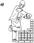 | Рис. 14.17. Схема кладки стен порядным и ступенчатым способами: а – порядный способ; б – ступенчатый; в – смешанный (буквой П обозначены ряды, укладываемые каменщиком-подсобником 2 разряда; г , д – позы каменщика при укладке кирпичей порядным и ступенчатым способами соответственно; 1... 36 – последовательность укладки кирпича |