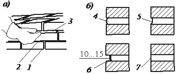 а – расшивка наружных швов; б – виды расшивки швов; 1 – вертикальные швы; 2 – горизонтальные швы; 3 – расшивка; 4, 5 – шов соответственно выпуклый и вогнутый; 6, 7 – шов заглубленный и вподрезку