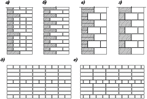 а – при многорядной перевязке; б – то же при однорядной; в – стена из керамических камней с облицовкой из кирпича; г – то же с облицовкой керамическими камнями; д – кладка без перевязки вертикальных швов наружной версты; е – то же с перевязкой вертикальных швов в пределах трех рядов кладки