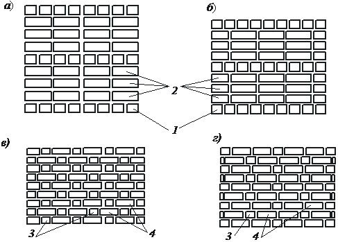 а – со сплошными вертикальными швами; б – с прерывающимися вертикальными швами; в – готическая; г – крестовая сложная; 1 – тычковый ряд; 2 – ложковый ряд; 3 – тычок; 4 – ложок