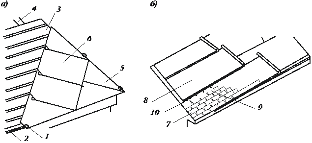 а – из асбоцементных плоских плиток; б – из мягких битумно-полимерных плиток; 1 – противоветровая скоба; 2 – уравнительная рейка; 3 – настил; 4 – стропильная нога; 5 – доборная плитка; 6 – плоская плитка; 7 – мягкая плитка; 8 – подкладочный слой; 9 – клей; 10 – гвозди