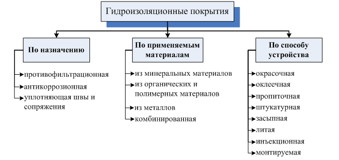 Различают первичную гидроизоляцию, которая обеспечивается водонепроницаемостью материала самой конструкции, вторичную гидроизоляцию конструкции специальными покрытиями и комбинированную гидроизоляцию, состоящую из нескольких покрытий, дополняющих друг друга.