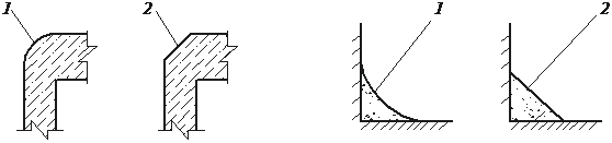 До начала изоляционных работ очищают от строительного мусора помещения, замоноличивают стыки сборных конструкций, устанавливают крепежные детали для монтажа оборудования и гильзы для пропуска через ограждающие конструкции инженерных коммуникаций. Изолируемая поверхность для всех видов гидроизоляции выравнивается, раковины и провесы в стыках сборных изделий затираются цементным раствором. Выступающие из бетона арматурные стержни, проволока, болты предварительно срезаются. Наружные (выступающие) углы затупляются путем устройства фаски или закругления, а во внутренних входящих углах делается выкружка из цементного раствора (рис. 17.2). Основания очищают от пыли и грязи струей сжатого воздуха, механическими щетками или водой.