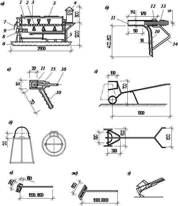 а – передвижной битумоварочный котел для приготовления битумных мастик; б, в – воздушная и бескомпрессорная форсунки для нанесения горячих битумных мастик; г – транспортная тележка; д – транспортное ведро; е – брезентовая щетка; ж – резиновый гребок; з – ковш-шпатель: 1 –котел; 2 – лопастная мешалка; 3 – крышки котла; 4 – дымовая труба; 5 – топка; 6 – полозья; 7 – металлическая сетка; 8 – кран; 9 – рукоятка мешалки с редуктором; 10 – материальная труба; 11 – сопло; 12 – зажимной винт; 13 – воздушная труба; 14 – рукоятка;