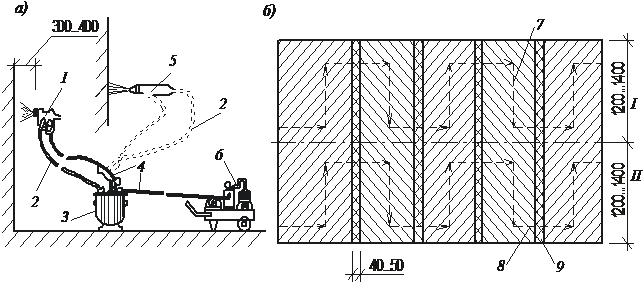 а – схема установки для нанесения изоляционных материалов; б – схема перемещения пистолета-распылителя при нанесении изоляции: 1 – пистолет-распылитель; 2, 4 – материальный и воздушный шланги; 3 – красконагнетательный бачок; 5 – форсунка; 6 – компрессор; 7, 8 – рабочий и холостой ходы распылителя; 9 – перекрытие смежных полос; I, II – ярусы
