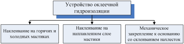 Оклеечная гидроизоляция состоит из одного или нескольких слоев рулонных гидроизоляционных материалов, приклеиваемых или механически закрепляемых к изолируемой поверхности, с обязательной защитой поверхностными стяжками и стенками.