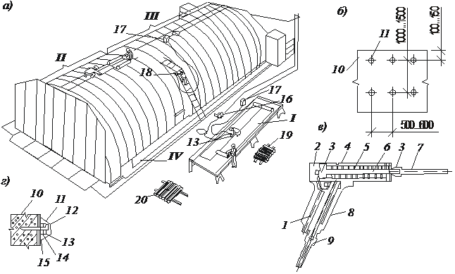 а – схема организации работ на объекте; б – схема крепления рулонных материалов к стенам; в – схема электровоздушной горелки для сварки ПВХ пластиката и полиэтилена; г –деталь крепления дюбелей; 1 – электрокабель; 2 –кожух; 3 – накидные гайки; 4 – корпус; 5 – нагревательная спираль; 6 – фарфоровая трубка; 7 – наконечник; 8 – рукоять; 9 – патрубок; 10 – изолируемая конструкция; 11 – накладка (d = 100мм) из материала рулонного ковра; 12 – дюбель; 13, 14 –шайбы из стали и гидроизоляционного материала; 15 – сварной шов; 16 – компрессор; 17 – трансформатор; 18 – электровоздушная горелка; 19 – рулоны гидроизоляционного материала; 20 –заготовленные картины; I – заготовка картин; II – подготовка основания, подъем и раскатка картин; III – сварка рулонного материала электровоздушной горелкой; IV – усиление гидроизоляции в местах сопряжения арочных панелей фундаментами