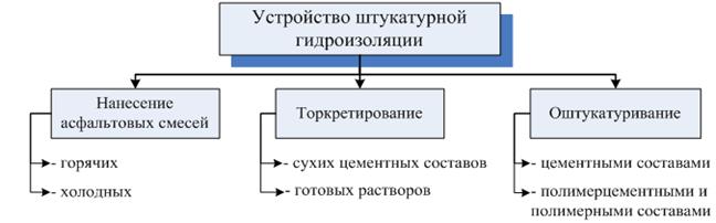 По способам устройства различают окрасочную, оклеечную, штукатурную, монтируемую, засыпную, литую, пропиточную и инъекционную гидроизоляцию.