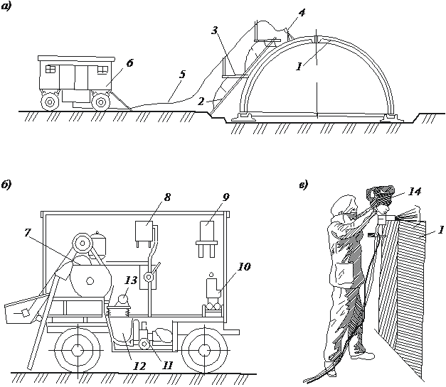 а - схема передвижной установки для приготовления и нанесения холодных асфальтовых мастик; б – схема организации работ при гидроизоляции холодными асфальтовыми мастиками арочного сооружения; в - нанесение горячей асфальтовой гидроизоляции асфальтометом; 1 – изолируемая поверхность; 2 – приставная лестница; 3 – переходной мостик; 4 – форсунка для нанесения мастики; 5 – материальный шланг; 6 – установка для приготовления и нанесения холодных асфальтовых мастик; 7 – растворосмеситель; 8 – бачок для антифриза; 9 – трансформатор; 10 – компрессор; 11 – растворонасос; 12 – бункер для масти-